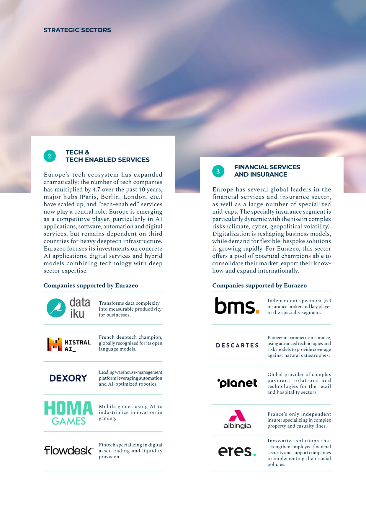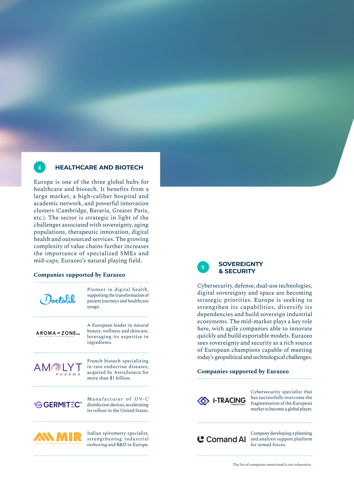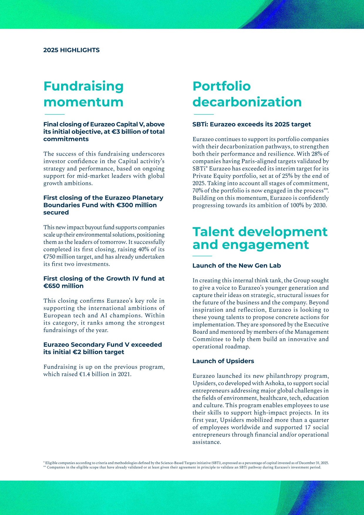 - ▰launch of the Ambition Europe 2025 fund, which forms part of Eurazeo’s Wealth Solutions offering and aims to build a diversified portfolio of 15 to 20 high‑potential European SMEs through minority stakes, combined with an active role in governance and operational acceleration. The fund’s investment focus is founded on three long‑term convictions: defense and sovereignty, technology and artificial intelligence, and healthcare.