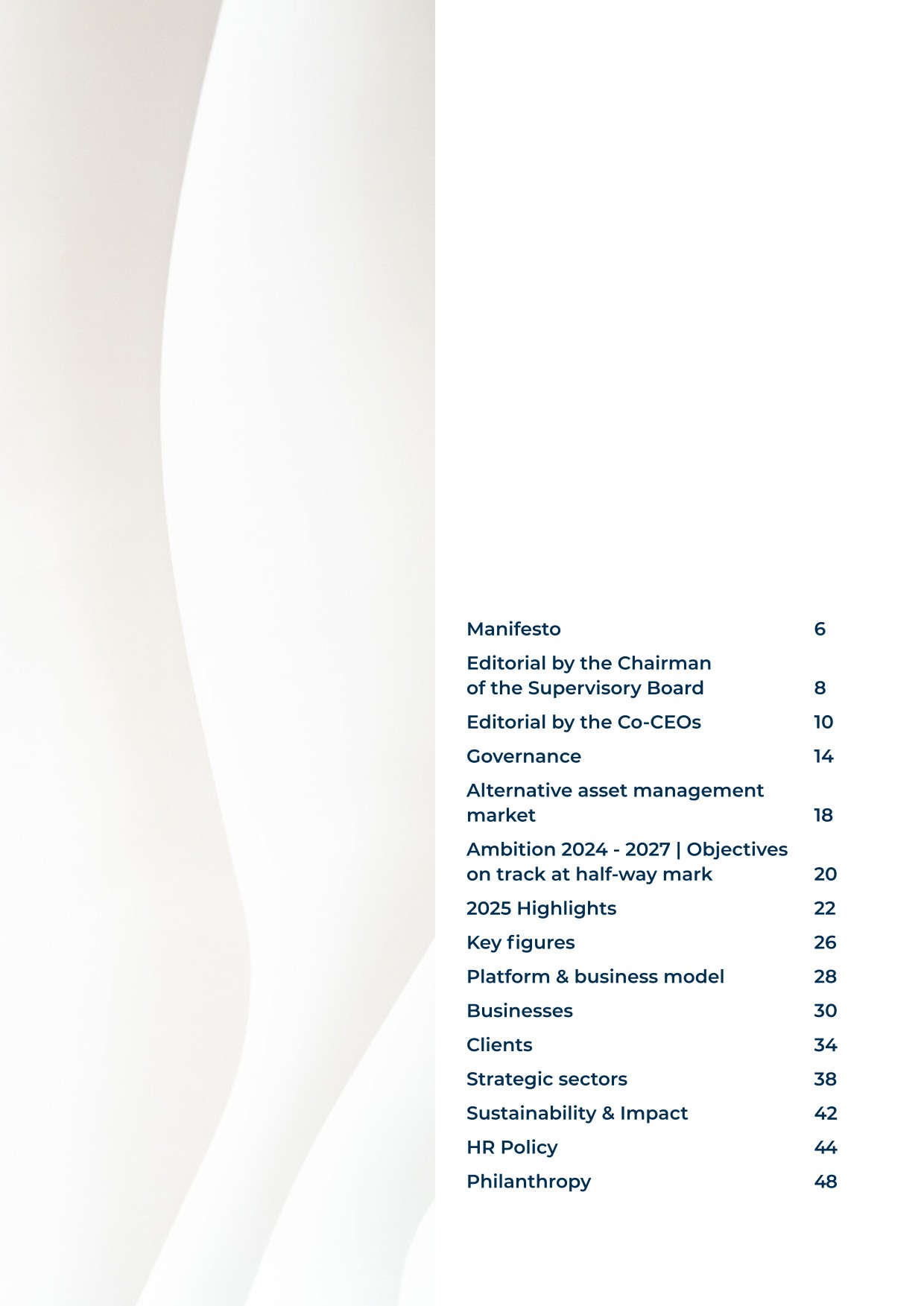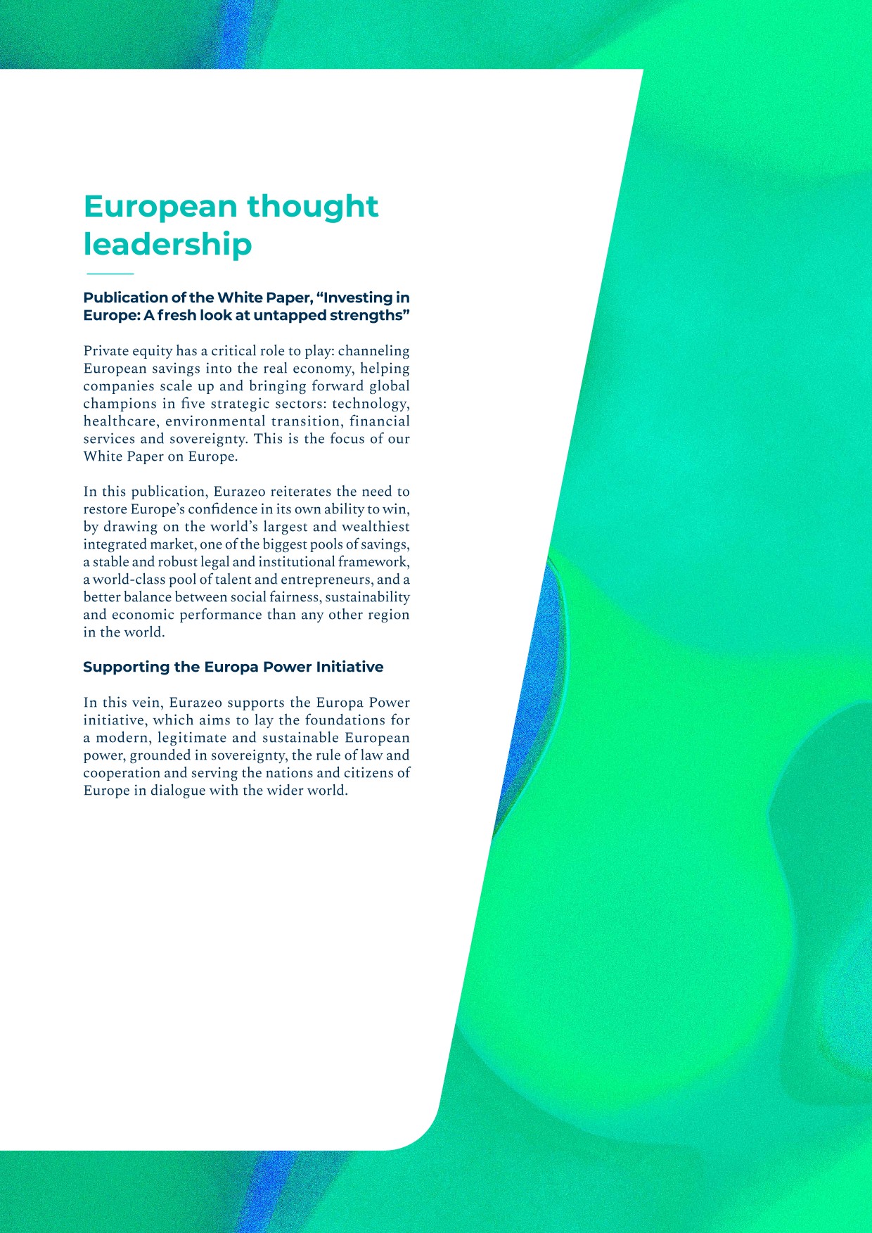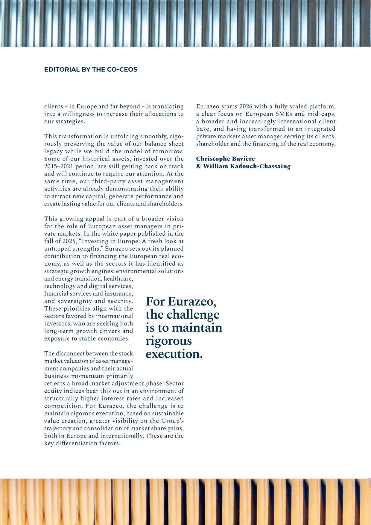 - ▰launch of the Ambition Europe 2025 fund, which forms part of Eurazeo’s Wealth Solutions offering and aims to build a diversified portfolio of 15 to 20 high‑potential European SMEs through minority stakes, combined with an active role in governance and operational acceleration. The fund’s investment focus is founded on three long‑term convictions: defense and sovereignty, technology and artificial intelligence, and healthcare.