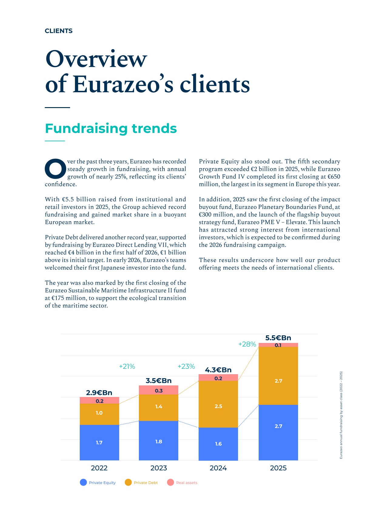 - ▰launch of the second vintage of the Article 9 infra debt fund, Eurazeo Sustainable Maritime Infrastructure II (ESMI II) and its first closing at the end of December 2025 at €175 million;