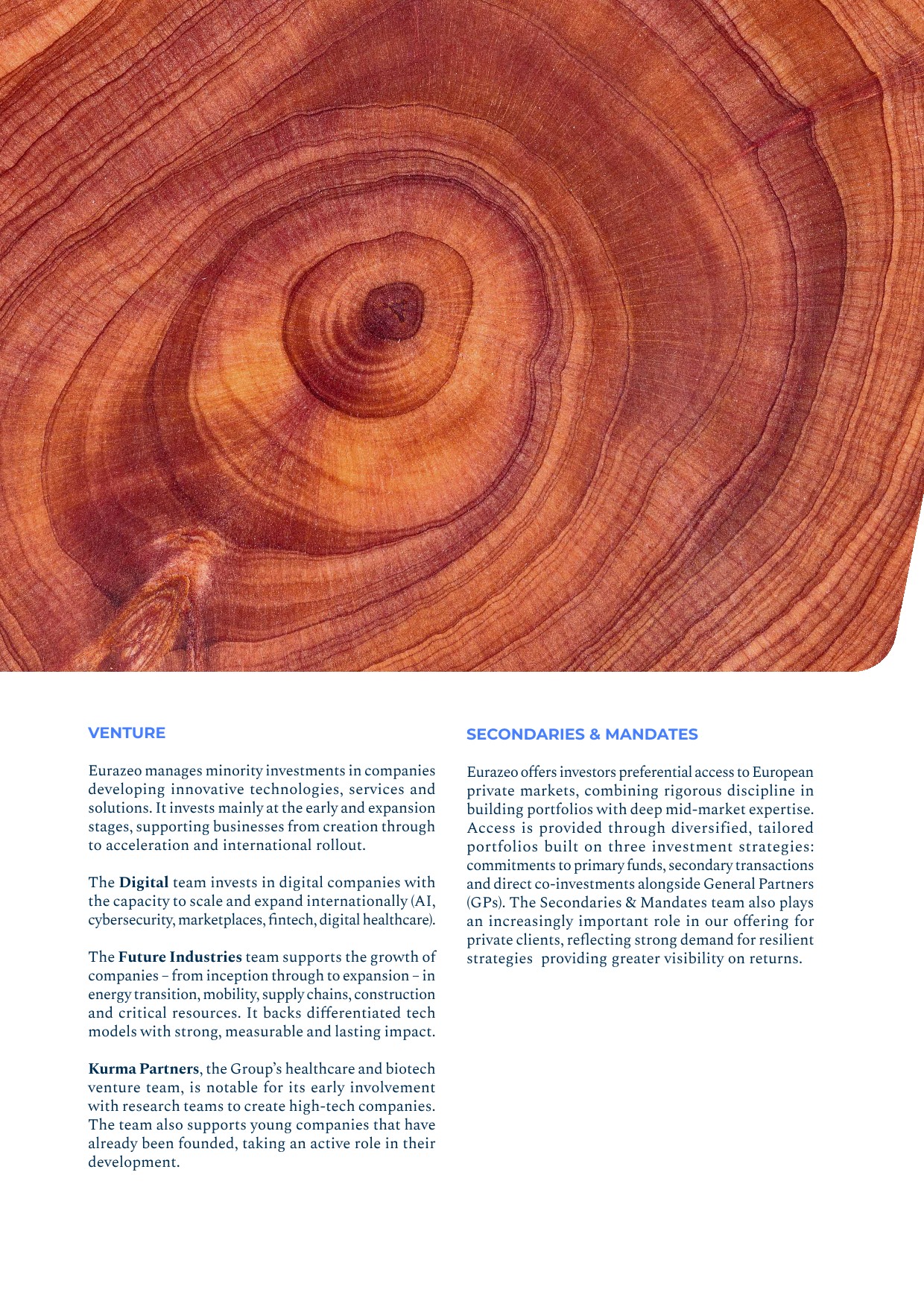 - ▰acquisition of the remaining Kurma Partners shares. Eurazeo’s acquisition of the remaining shares in this French asset management company specializing in biotechnology and medical innovation follows Eurazeo’s acquisition of a majority stake (70.6%) in 2021. Since 2009, and after raising nearly €600 million in assets, Kurma Partners has established itself as a key player in the European healthcare sector, supporting the most promising companies in the field. As an investor in Kurma Partners since 2021, Eurazeo has already committed nearly €100 million to its funds, providing operational support as well as access to its international platform;