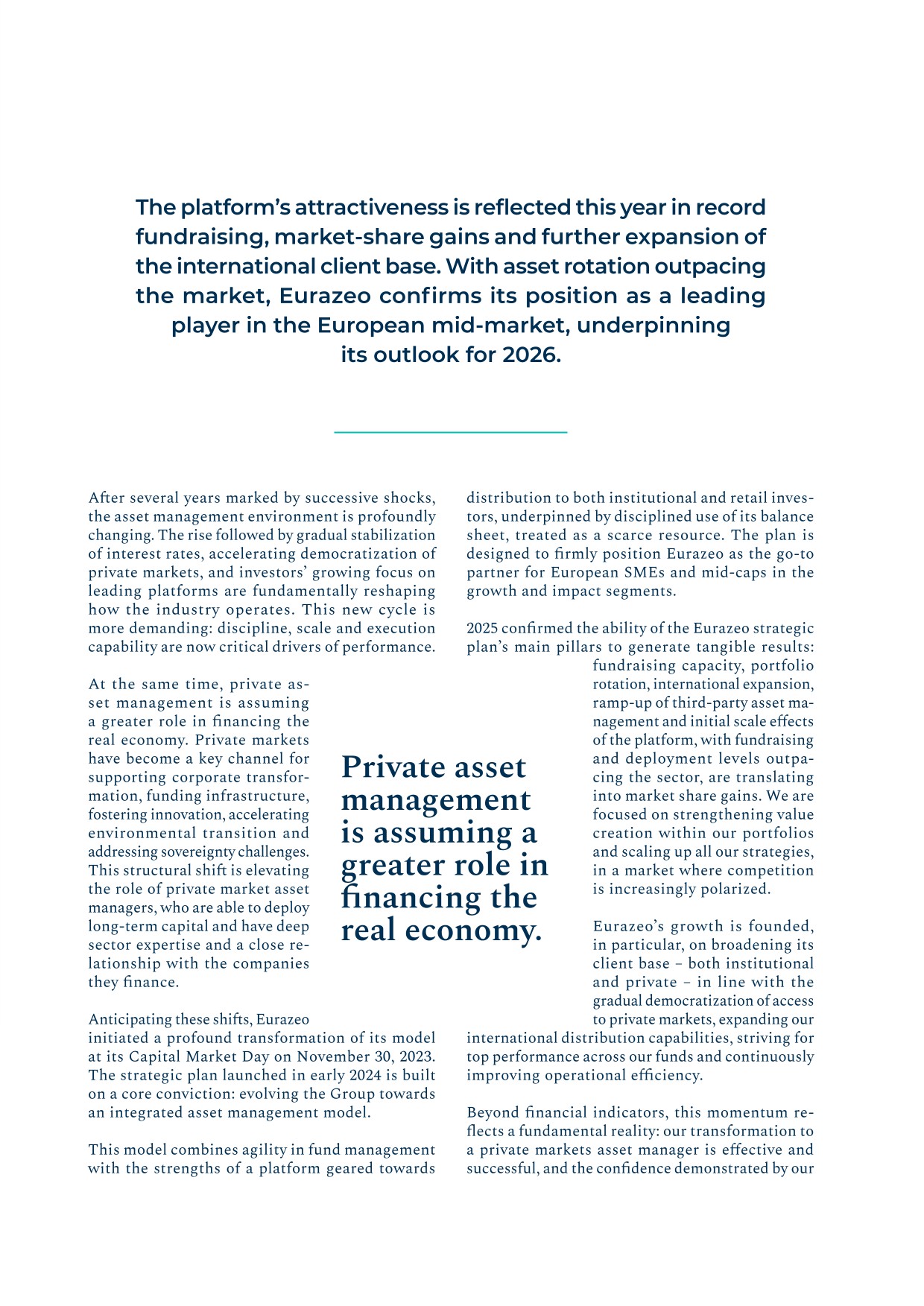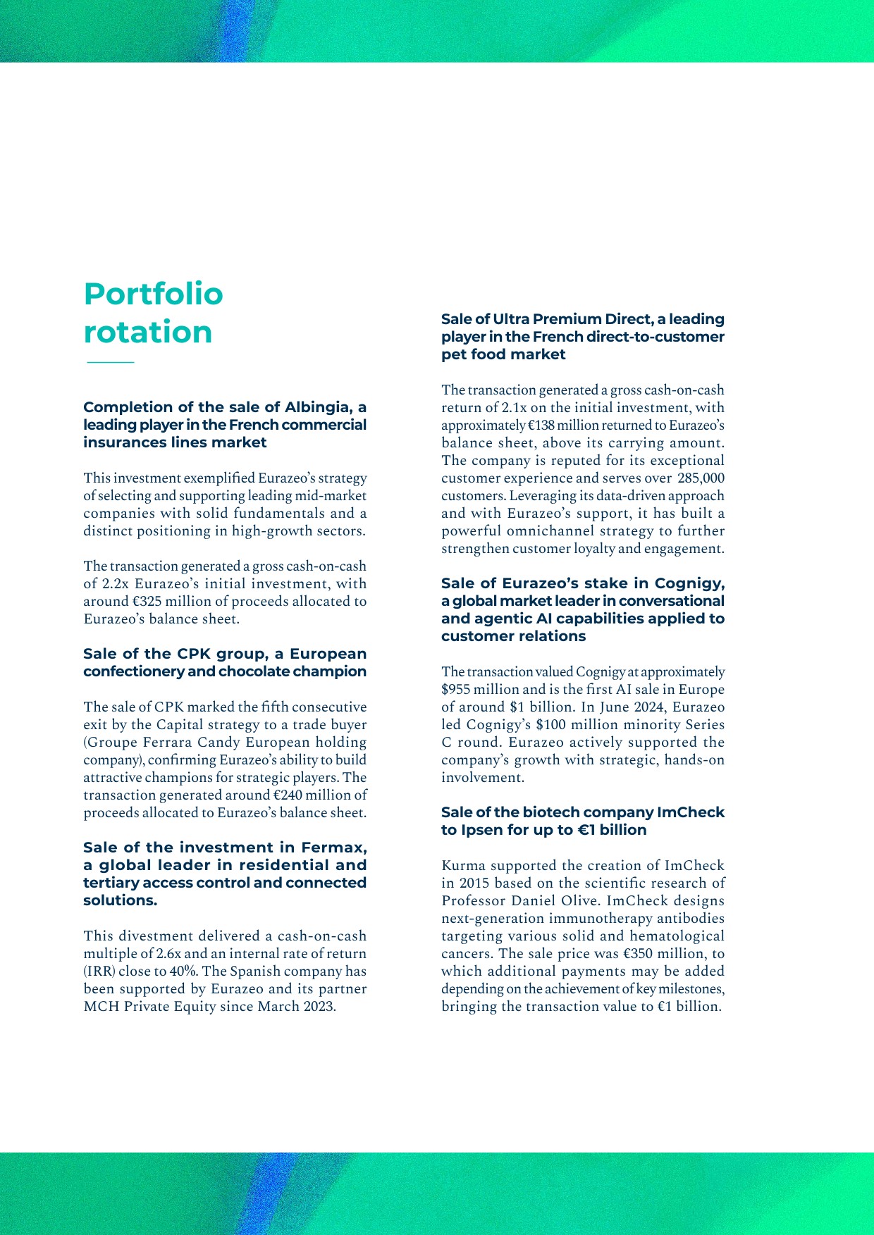 - ▰completion of the sale of Albingia, a leading player in the French commercial insurance lines market, to a consortium of investors led by La Financière de Blacailloux. With this investment, Eurazeo exemplifies its strategy of selecting and supporting mid‑market companies with solid fundamentals and a distinct positioning in high‑growth sectors. The transaction generated a gross cash‑on‑cash of 2.2x on Eurazeo’s initial investment, with around €325 million of proceeds allocated to Eurazeo’s balance sheet;