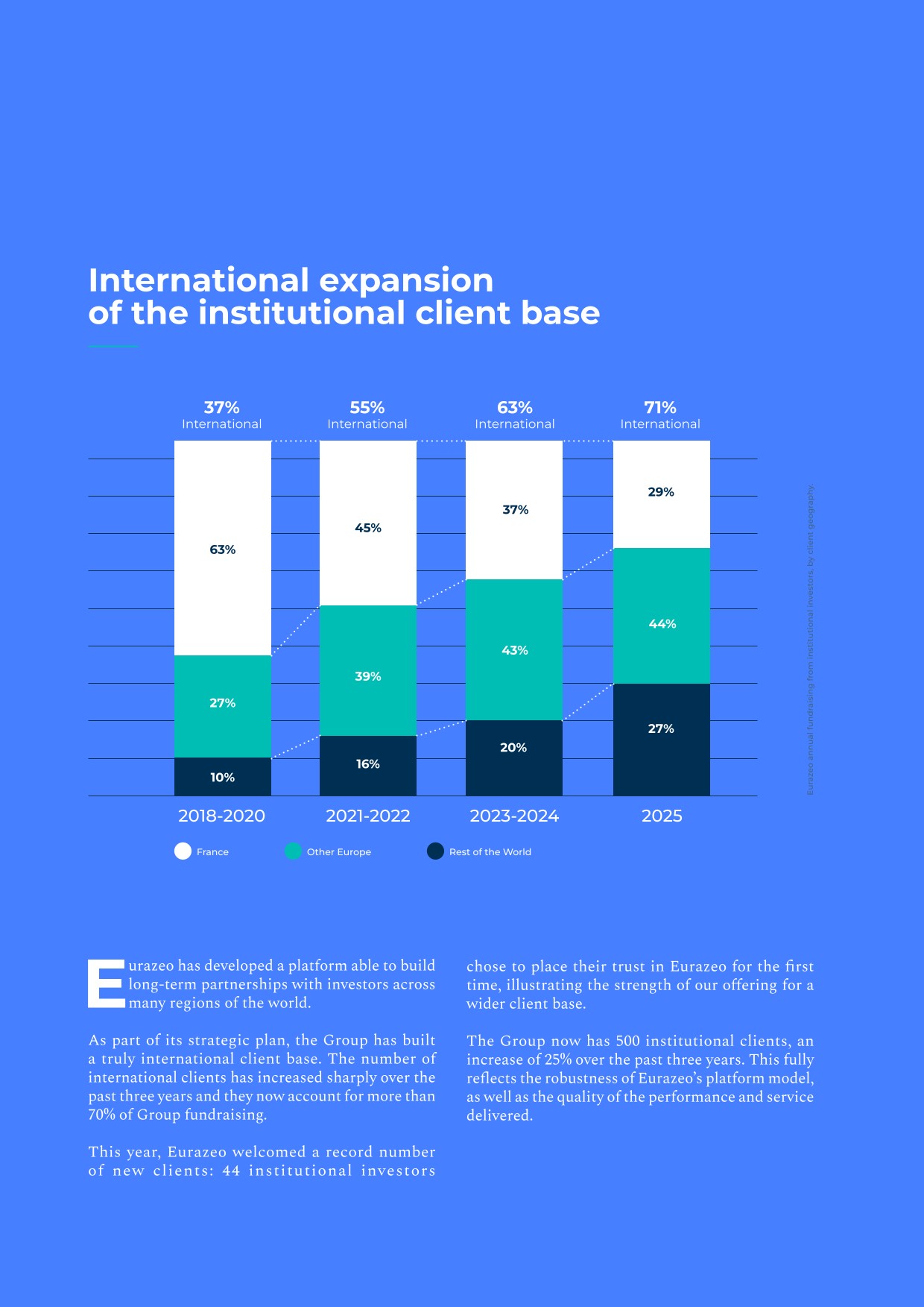 - ▰first closing of the fund with €300 million secured. Only ten months after the commercial launch of EPBF, Eurazeo successfully completed its first closing, representing 40% of the fund’s threshold target of €750 million;