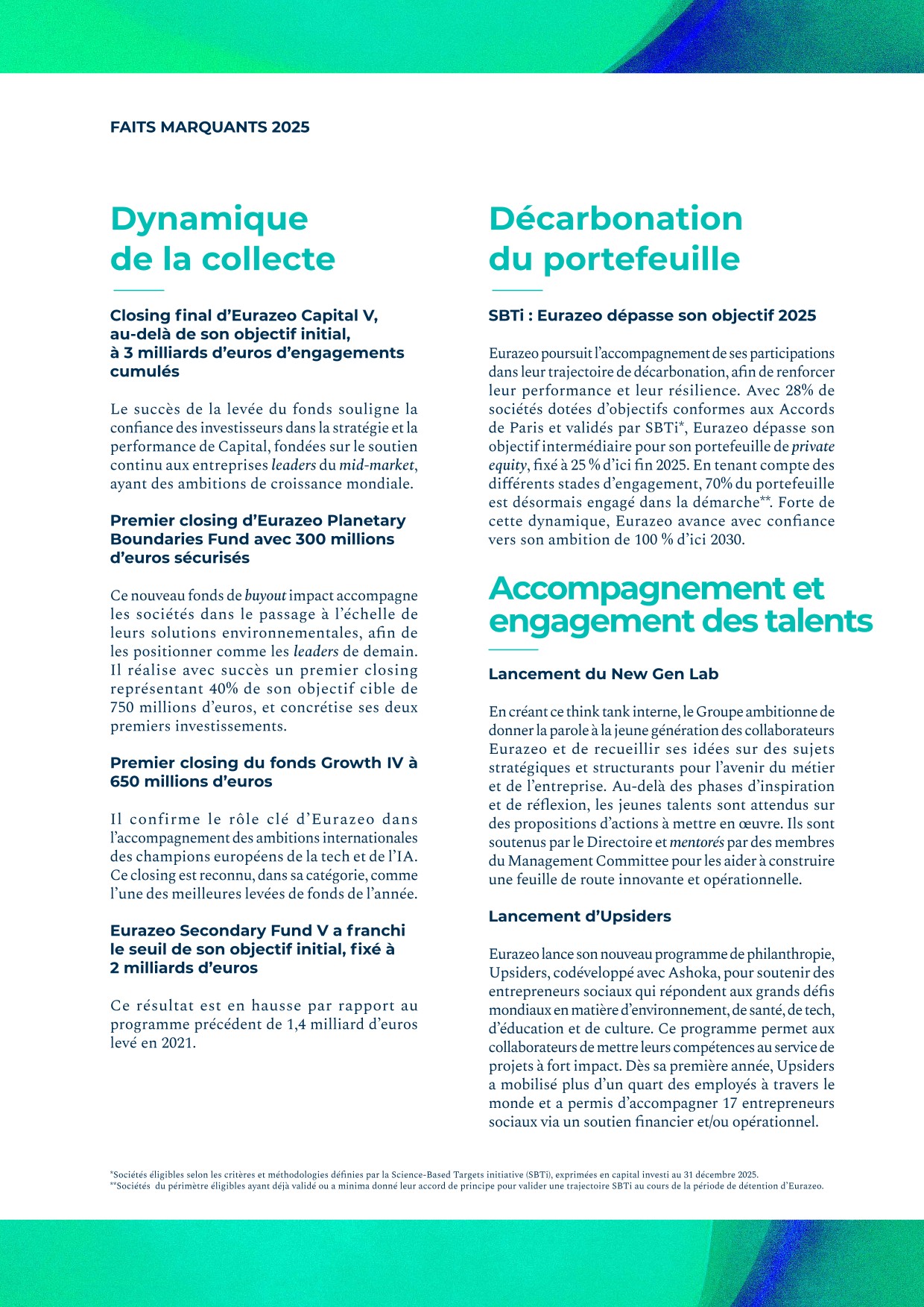 Les faits marquants mentionnés ci‑dessous sont une sélection d’événements et d’opérations réalisées au cours de l’année 2025, tant au niveau du Groupe, que de chacune des stratégies d’Eurazeo.